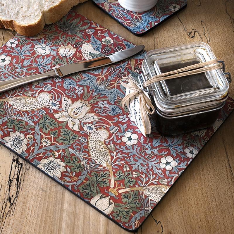Skapa en levande och inbjudande bordsmiljö med dessa bordstabletter dekorerade med det charmiga Strawberry Thief-motivet i varma röda toner. Den tåliga ytan skyddar mot värme och fläckar, medan basen i kork ger stabilitet och skonsamt stöd för bordsytan. Perfekta till både vardagsmiddagar och festligare tillfällen när du vill addera något tidlöst och dekorativt.