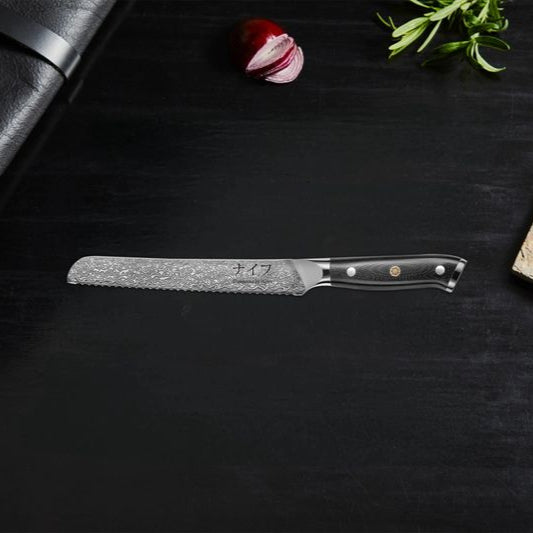 Damascus by Haws brödkniv 33 cm svart är det perfekta valet för dig som söker precision och elegans i varje brödskiva. Med ett blad tillverkat av 67 lager damaskusstål levererar denna brödkniv enastående skärpa och kontroll, oavsett om du skär genom hårda surdegsbröd eller mjuka vetelängder. Det tandade bladet gör snitten rena utan att trycka ihop brödet.