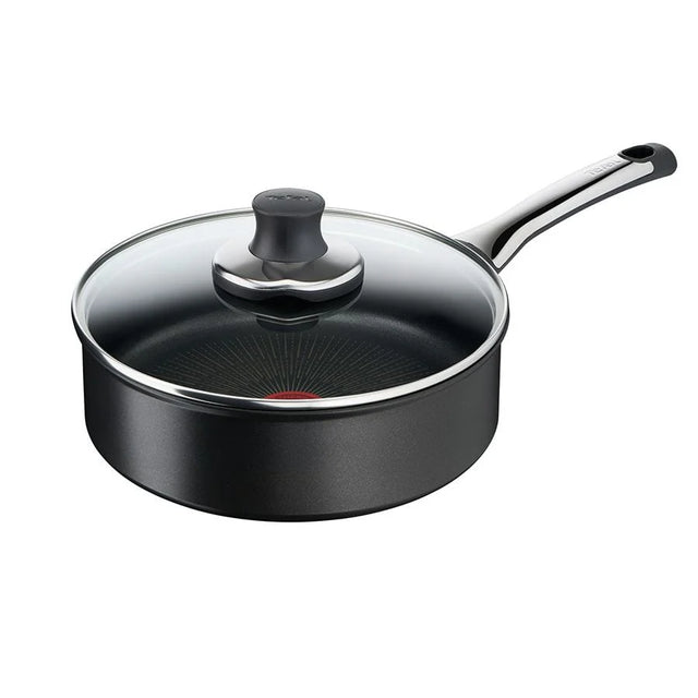 Den är utrustad med Tefals Thermo-Signal, en värmeindikator som visar när pannan är redo att användas. Den tjocka Thermo-Fusion Plus-basen ger jämn och snabb värmefördelning, vilket bidrar till jämna tillagningsresultat. Den djupa formen gör pannan mångsidig, och det medföljande locket gör att du enkelt kan tillaga rätter med vätska eller långkok.