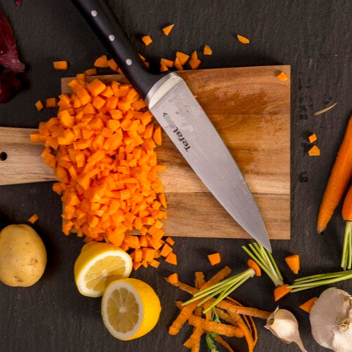 Knivbladen är tillverkade i tyskt rostfritt stål och genomgår en avancerad nedkylning till -120 °C efter uppvärmning. Det ger en extremt tålig yta och upp till dubbelt så lång livslängd jämfört med andra rostfria Tefal-knivar. Varje kniv är utrustad med handskydd för ökad säkerhet och har en välslipad egg med en 26° vinkel, vilket ger både precision och komfort i varje snitt.