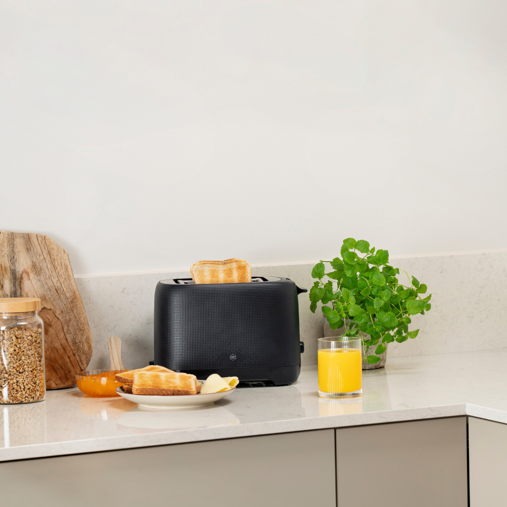 Morning brödrost från OBH Nordica kombinerar stilren design med praktisk funktion. Den mattsvarta finishen med mönstrad struktur ger ett elegant tillskott till köket, samtidigt som du enkelt rostar två brödskivor åt gången – precis som du vill ha dem.
