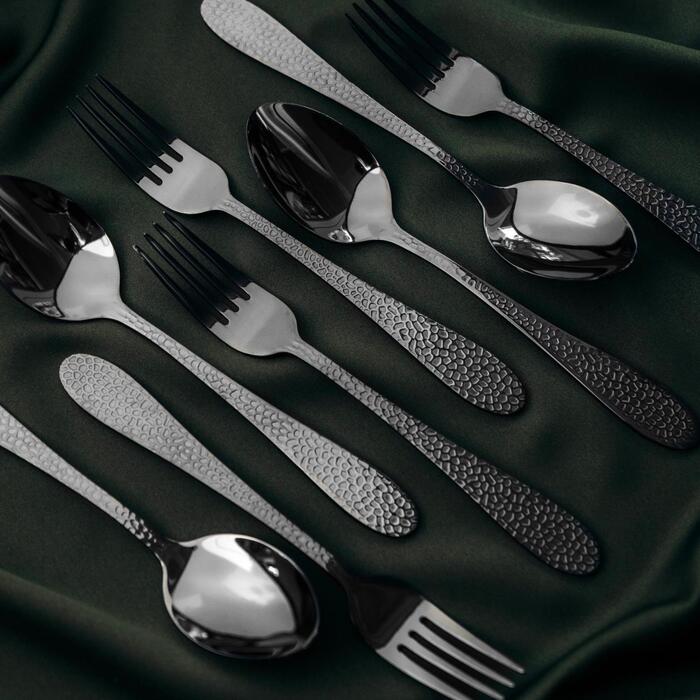 Frost Onyx från Vargen & Thor är ett stilrent set med dessert- och förrättsbestick som kombinerar funktion med en elegant design. Den hamrade ytan ger besticken ett unikt uttryck och reflekterar ljuset på ett vackert sätt. Setet innehåller fyra skedar och fyra gafflar – perfekta för allt från vardagsmiddagar till festliga tillfällen.