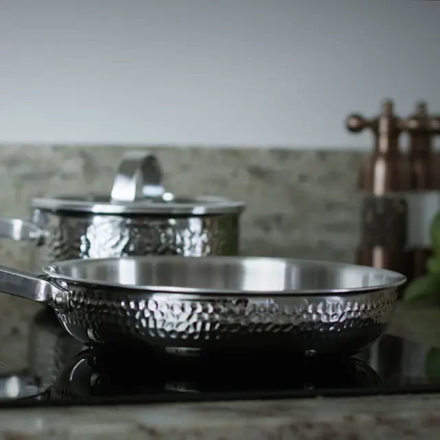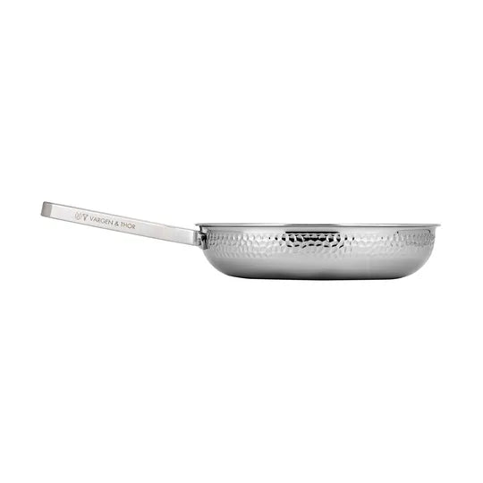 Kroma Modell MB JR från Vargen & Thor är en exklusiv stekpanna i 22 cm-storlek, skapad för dig som värdesätter både form och funktion i köket. Med sin eleganta, hamrade yta i polerat stål och smarta tekniska egenskaper är denna panna ett stilrent och praktiskt val för såväl vardagsmatlagning som finare tillfällen.