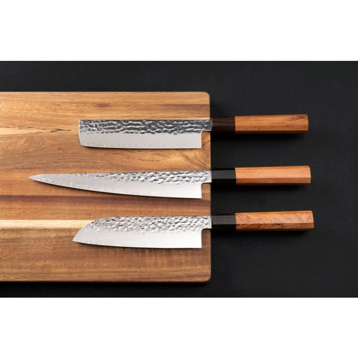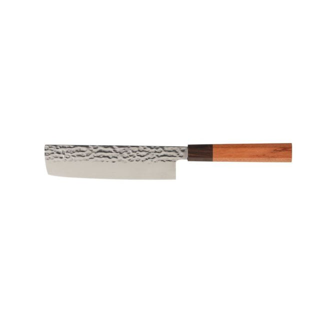 Nakiri-knivens rektangulära, raka blad är särskilt utformat för att hacka grönsaker med exakthet. Det tunna och lätta bladet gör det enkelt att göra jämna och precisa snitt, vilket ger ett effektivt arbetsflöde i köket. Handtaget, tillverkat av vackert kevazingo och ebenholts, är ergonomiskt utformat och ger ett säkert och bekvämt grepp. Denna kniv är ett perfekt val för både professionella kockar och matentusiaster som värdesätter noggrannhet, kvalitet och elegans. Endast handtvätt rekommenderas för att bevara dess fina material och skärpa.