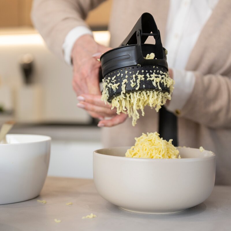 Tack vare nonstick-beläggningen släpper maten lätt från pressen, vilket minimerar spill och underlättar rengöringen. Det ergonomiskt utformade handtaget ger ett stabilt och bekvämt grepp även vid större mängder. För att bevara funktion och beläggning rekommenderas handdisk.