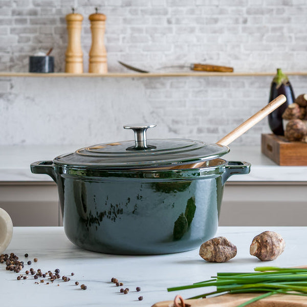 Stenfors Gjutjärnsgryta 4,4 L Grön från Anders Petter är en stilfull och slitstark gryta som förenar klassisk design med modern funktion. Den är tillverkad av emaljerat gjutjärn, ett material som utmärker sig genom sin förmåga att fördela och hålla värme jämnt och effektivt – perfekt för långkok, grytor och mustiga soppor. Emaljbeläggningen gör grytan enkel att rengöra och motståndskraftig mot smak- och luktpåverkan. Locket är utrustat med en smart knopp som leder kondens tillbaka ner i grytan, vilket bevarar smak och saftighet i rätten. Med sin eleganta gröna färg blir grytan dessutom ett snyggt inslag på matbordet. Den är kompatibel med alla värmekällor, inklusive induktion, och tål ugnstemperaturer upp till 250°C.
