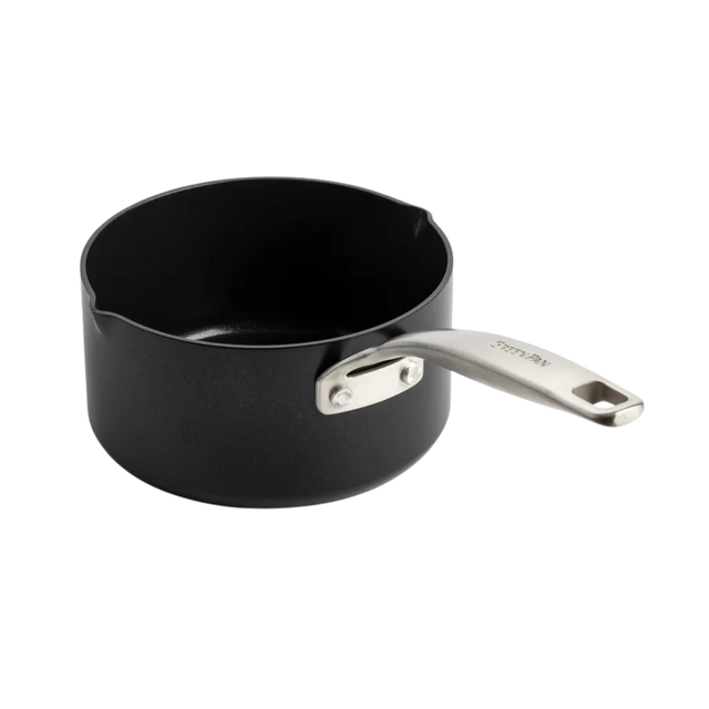 Kastrullen är tillverkad i hållbart aluminium och utrustad med GreenPans Thermolon™ Infinity Pro – en keramisk non-stick-beläggning som är förstärkt med diamant och helt fri från PFAS. Detta garanterar både hälsosam matlagning och enkel rengöring. Det rostfria stålhandtaget är ergonomiskt utformat och ugnssäkert upp till 220 °C, vilket gör kastrullen extra mångsidig.