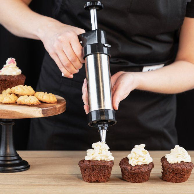 Kakspritsen är tillverkad i en kombination av slitstark aluminiumlegering, rostfritt stål och ABS-plast – material som ger både hållbarhet och komfort. Den greppvänliga utformningen och det enkla trycksystemet gör verktyget lätt att hantera även för nybörjare.