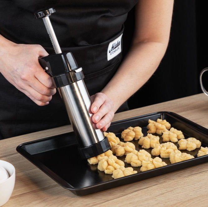 Med Maku Kitchen Lifes kaksprits blir bakningen både enkel och rolig. Denna praktiska spritspistol är utformad för att skapa jämna och vackra kakor samt dekorera tårtor med precision. Fyll bara pistolen med kakdeg, välj en av de 13 medföljande kakformarna, och tryck av mot den förberedda plåten. För tårtor och bakverk byter du enkelt till en av de 8 olika tyllarna för att spritsa grädde, glasyr eller smörkräm.
