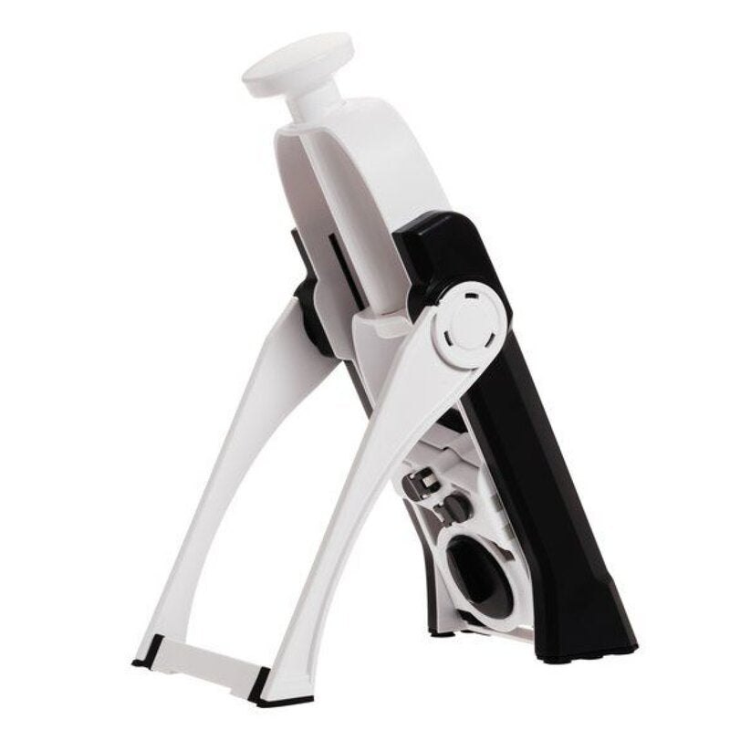 Den halkfria basen säkerställer att mandolinen står stadigt under användning, vilket gör arbetet både säkrare och mer effektivt. När den inte används kan du enkelt fälla ihop den för kompakt och smidig förvaring – ett stort plus för dig med begränsat utrymme i köket.