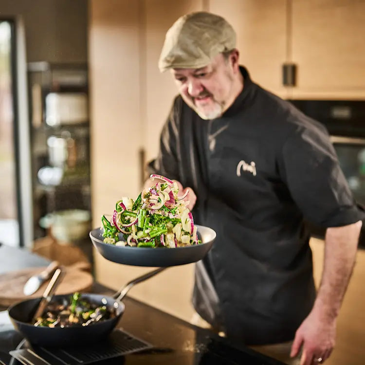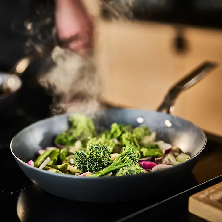 Pannan fungerar på alla värmekällor, inklusive induktion, och är perfekt för höga temperaturer där du snabbt vill försluta råvaror och bevara smak och näring. Med rätt skötsel håller den i många år och blir bara bättre med tiden.