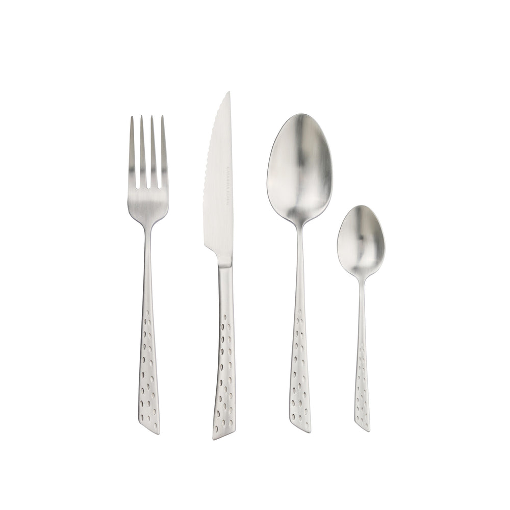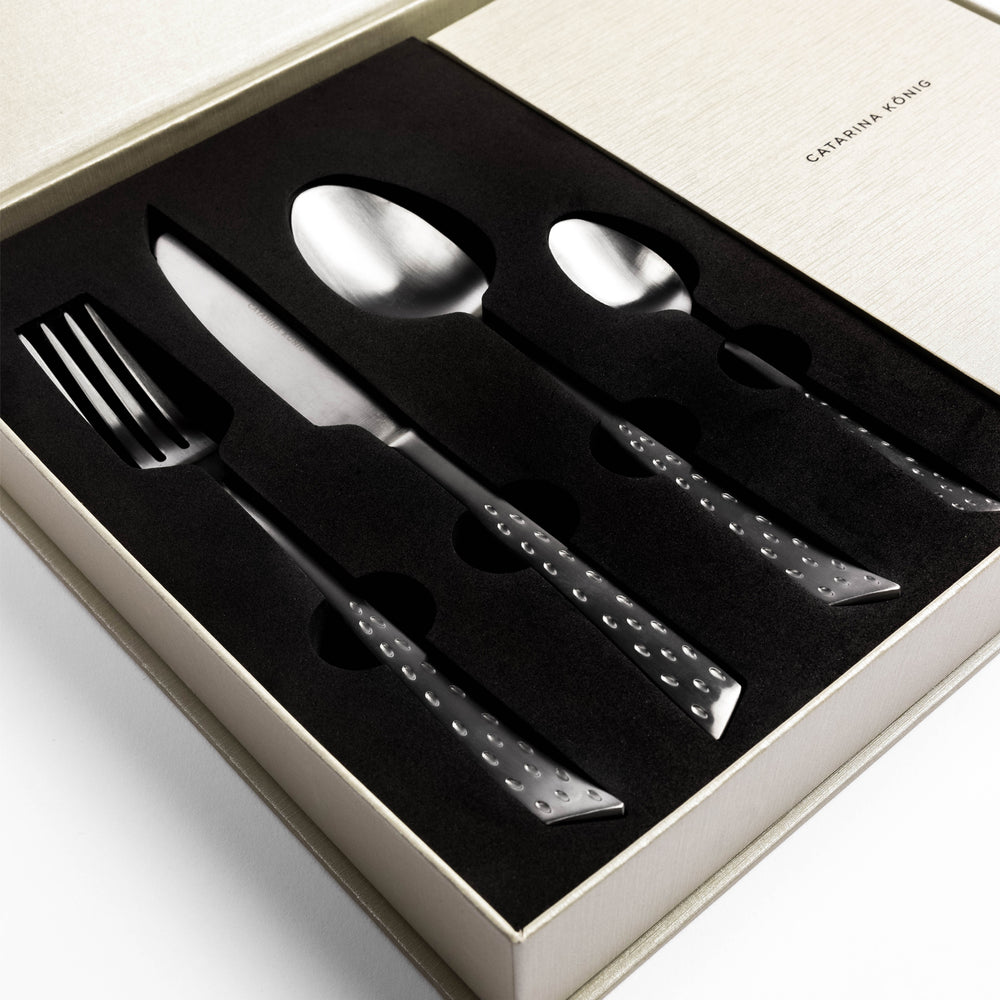 Ett bestickset för sex personer som passar lika bra till vardagsmiddagar som när du dukar för gäster. Besticken ligger bra i handen och är enkla att använda vid alla typer av måltider. Den matta ytan och det diskreta mönstret ger dukningen ett personligt men stilrent uttryck. Setet tål maskindisk och levereras i en exklusiv presentkartong.
