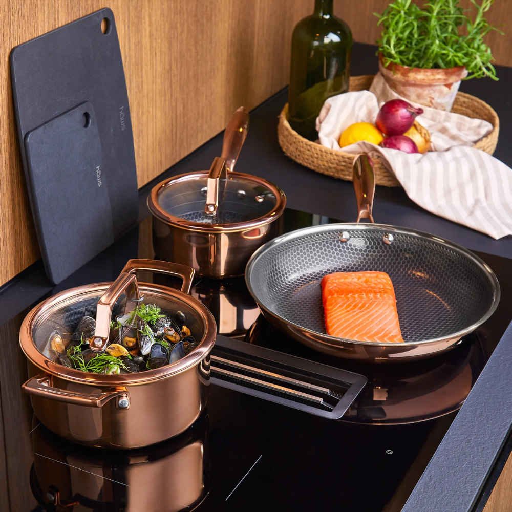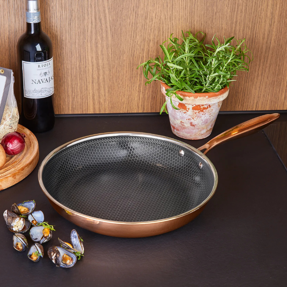 Den här stekpannan från Hâws Santo-serien är framtagen för dig som vill laga mat med precision och glädje varje dag. Den smarta hybridbeläggningen tillsammans med tre lager rostfritt stål ger jämn värme och fina stekresultat, oavsett om du steker kött, fisk eller grönsaker. Den PFAS-fria ytan är tålig nog för metallredskap och gör pannan till ett hållbart val i köket. Det ergonomiska handtaget ligger skönt i handen och pannan kan även användas i ugn upp till 260°C.