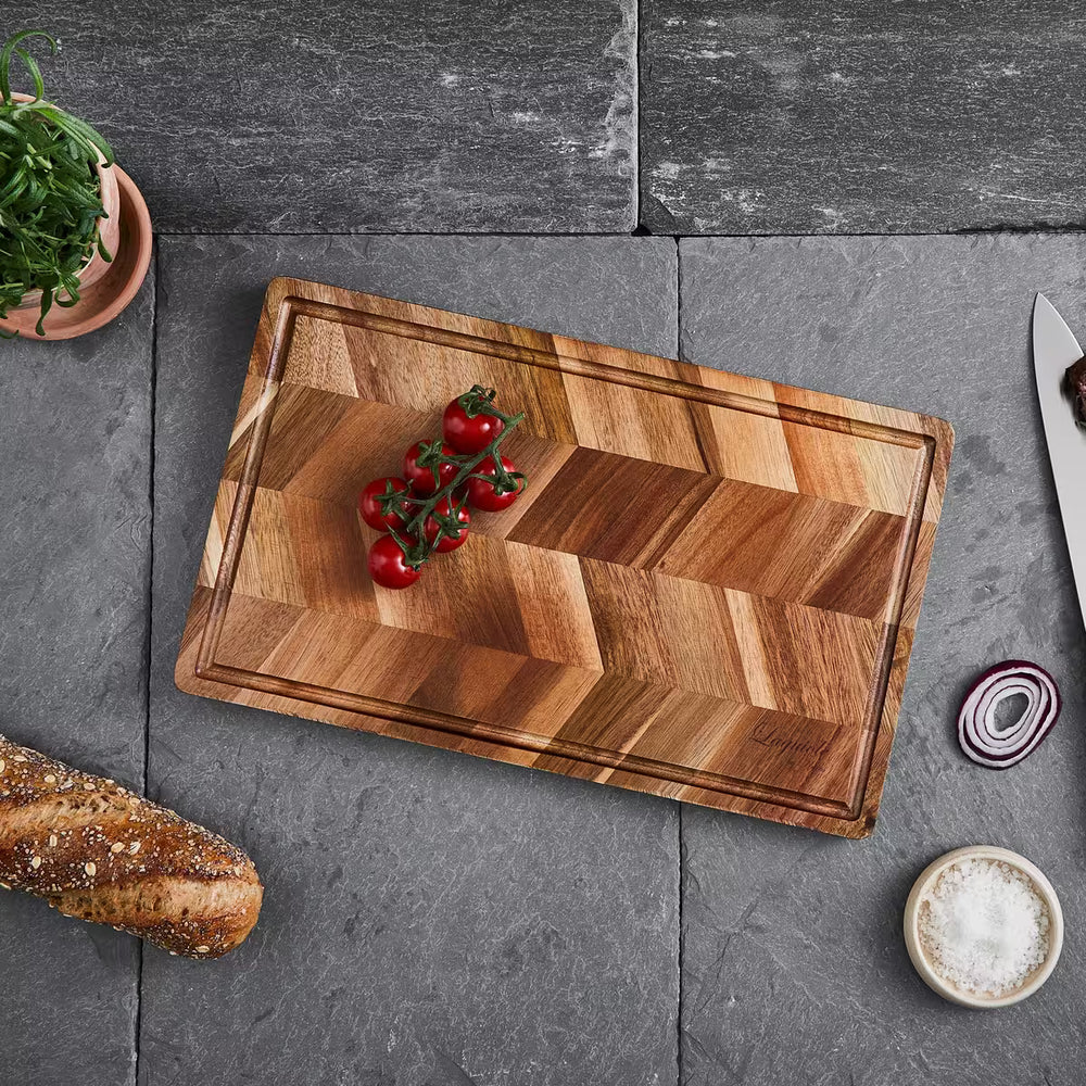 Denna skärbräda i vackert akaciaträ är ett praktiskt och stilfullt tillskott i köket. Det smarta saftspåret längs kanten samlar upp vätska från kött, frukt och grönsaker och håller arbetsytan ren. Den släta ytan är skonsam mot knivbladen och hjälper till att bevara skärpan längre. Med sin tidlösa design passar brädan lika bra på köksbänken som på det dukade bordet.