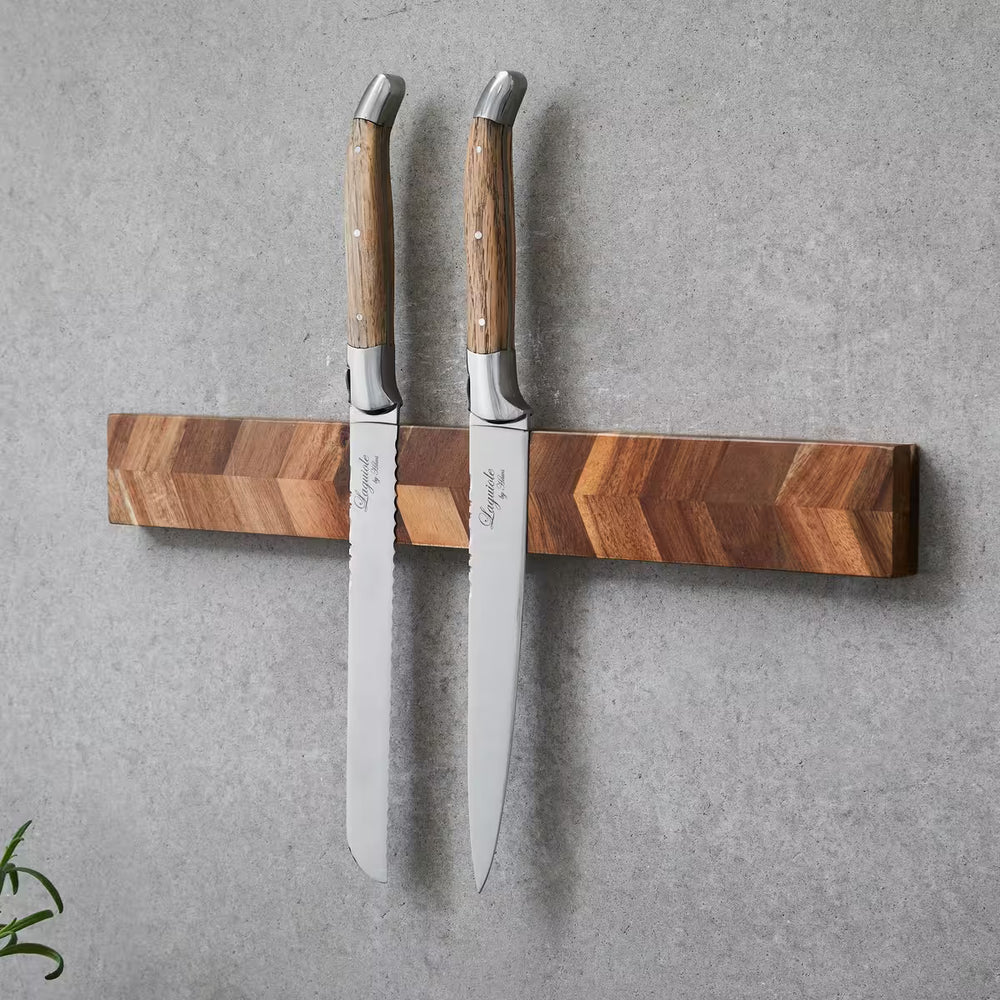 Denna magnetiska knivlist i akaciaträ hjälper dig att hålla ordning i köket på ett snyggt och praktiskt sätt. Knivarna sitter stadigt tack vare den kraftiga magneten och är alltid nära till hands, samtidigt som bladen skyddas och arbetsytan hålls fri.
