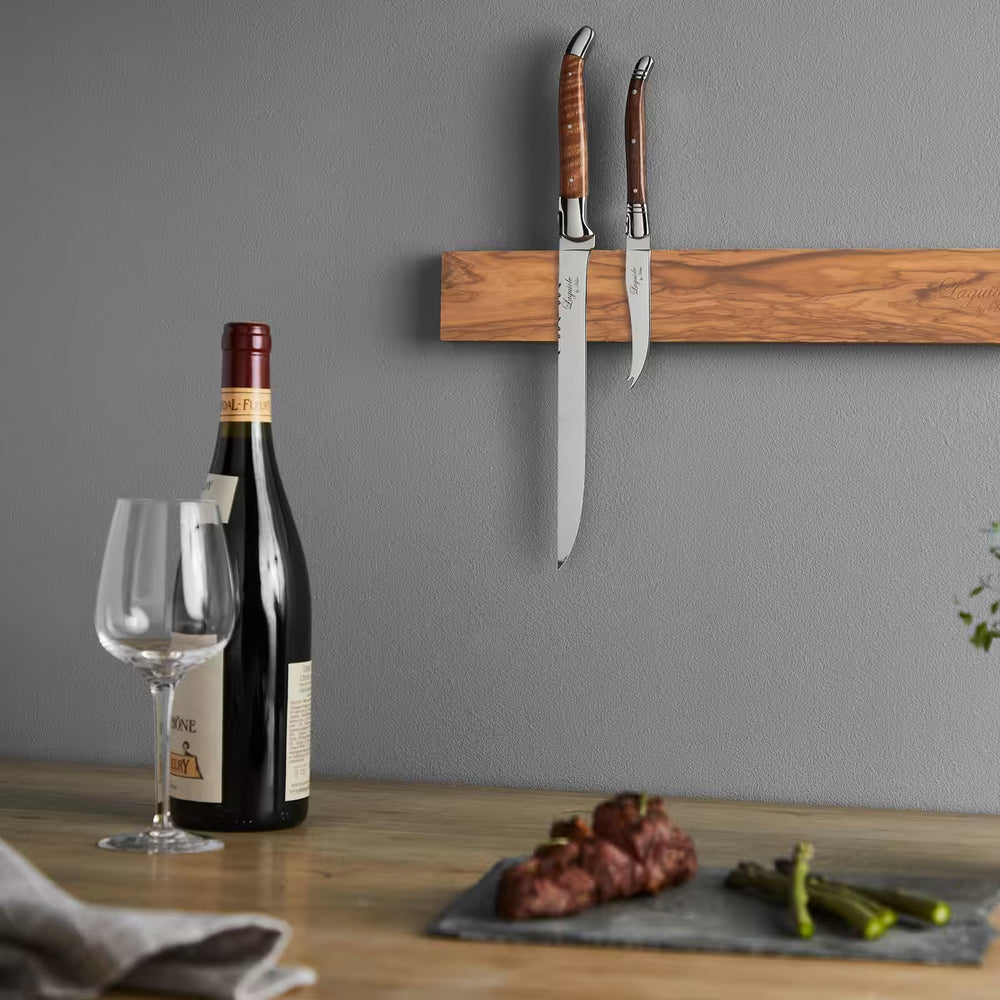 Denna magnetiska knivlist i vackert olivträ skapar ordning i köket på ett både praktiskt och stilfullt sätt. Den kraftiga magneten håller knivarna säkert på plats och gör dem enkla att nå, samtidigt som bladen skyddas från onödigt slitage. Den slimmade, minimalistiska designen sparar bänkyta och ger köket en varm och exklusiv känsla. Perfekt för dig som vill kombinera funktion med genomtänkt design.