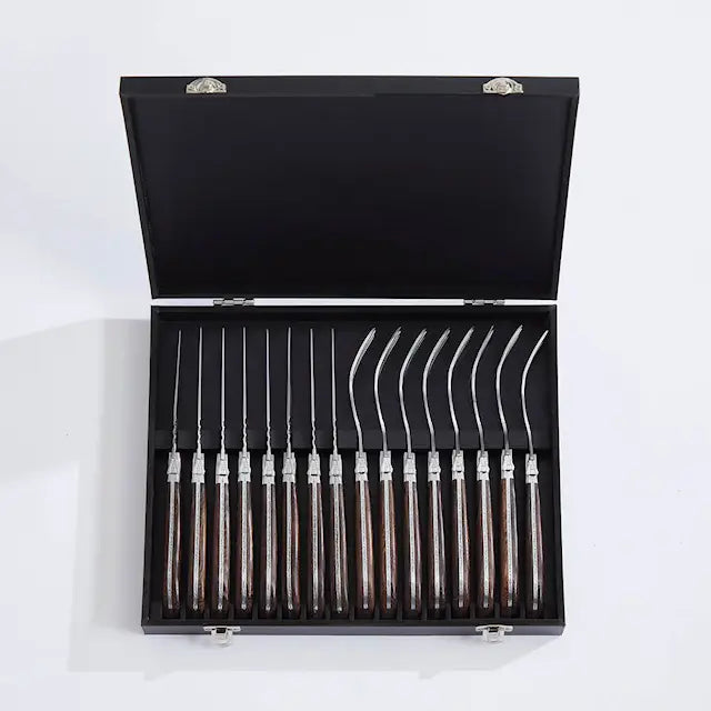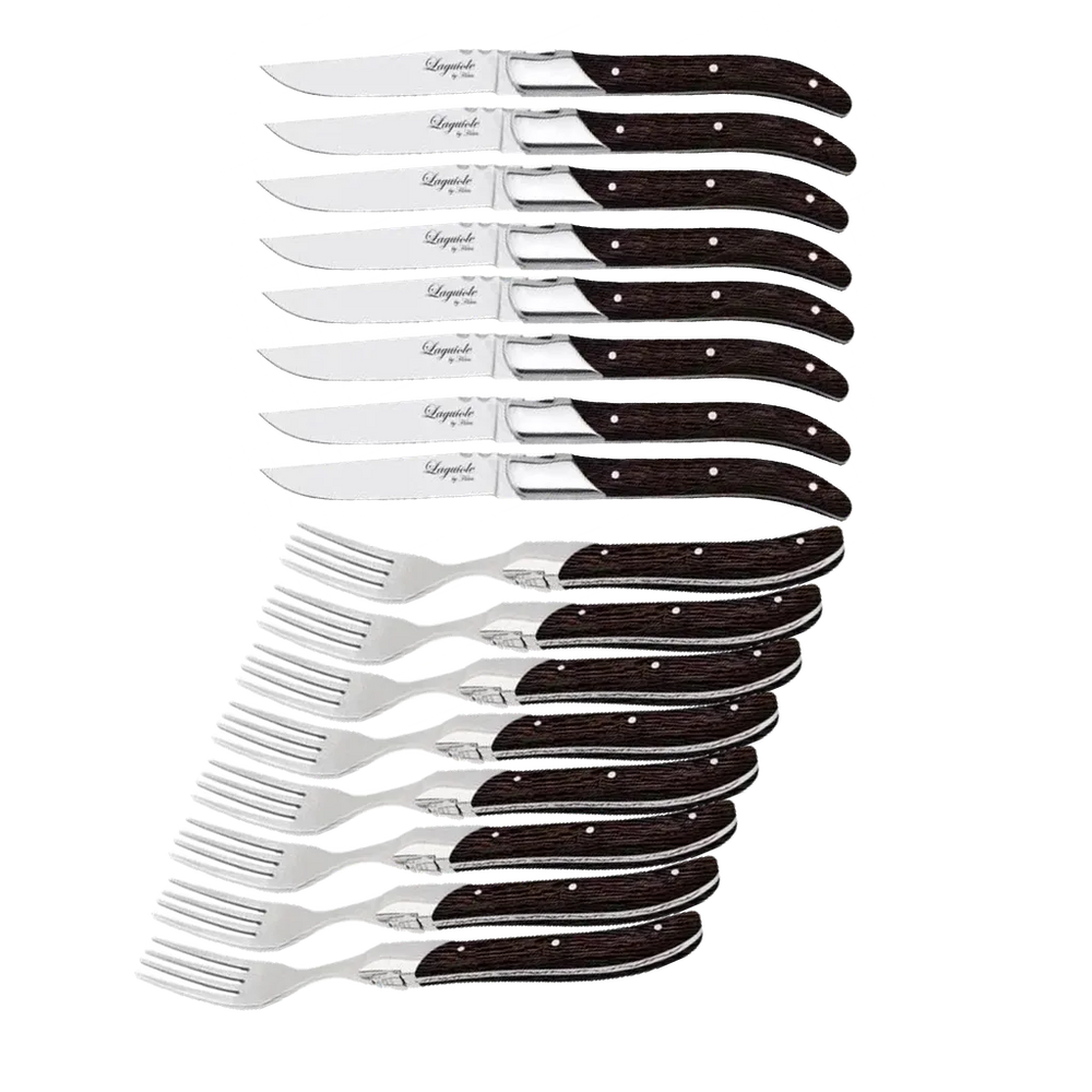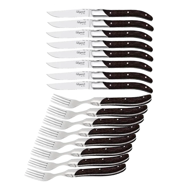 Ett gediget grillbestickset som gör varje måltid runt grillen lite mer speciell. De vassa grillknivarna skär enkelt genom kött och gafflarna ger ett stabilt grepp vid servering och ätande. Handtagen i mörkt wengéträ ger en elegant tyngd i handen och gör varje bestick unikt i sitt uttryck. Setet levereras i en svart trälåda och passar perfekt både som present och för stilfull vardagsanvändning.