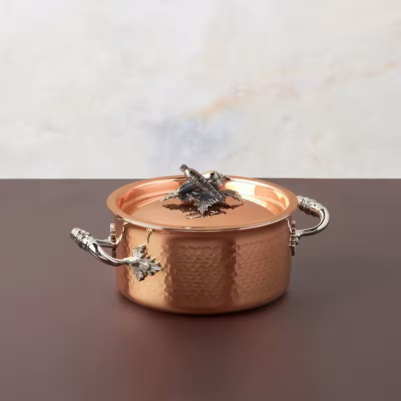 Ruffoni är ett anrikt italienskt varumärke som tillverkar sina köksredskap för hand i Italien. I Opus Cupra-serien möts traditionellt hantverk och konstnärlig design, där varje detalj formas med stor omsorg. Handtagen pryds av eleganta bladmotiv och det handhamrade kopparlocket dekoreras med handgjutna detaljer i massiv brons med silverplätering. Varje gryta är ett unikt uttryck för italiensk kvalitet, estetik och matglädje.