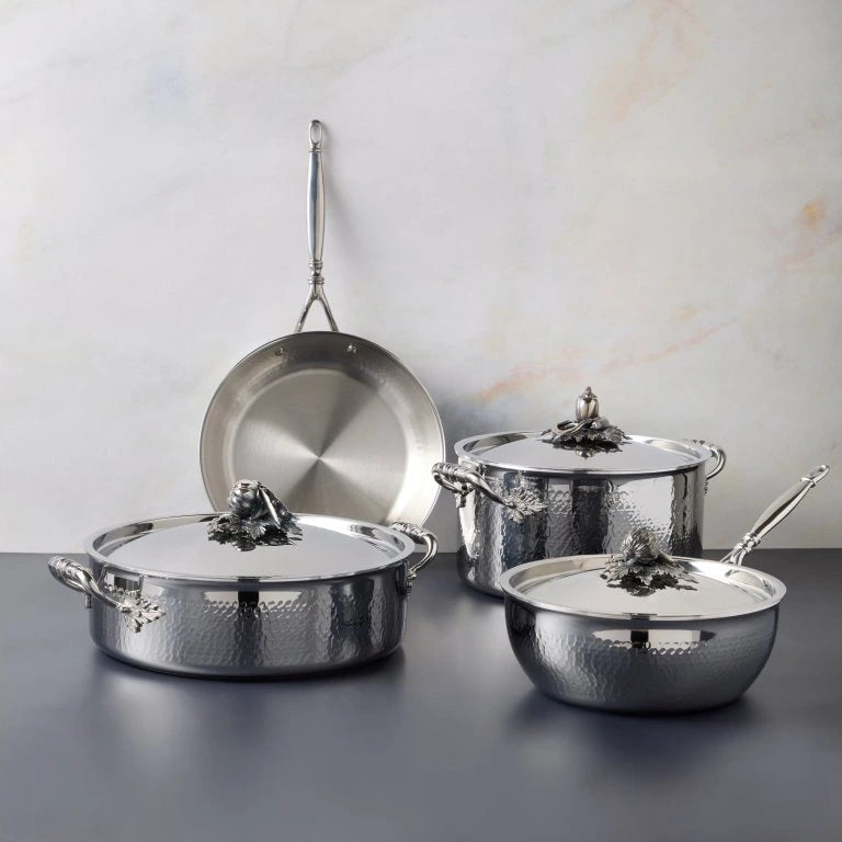 Ruffoni är ett anrikt italienskt varumärke som tillverkar sina köksredskap för hand i Italien med stor respekt för tradition och kvalitet. Varje detalj formas av skickliga hantverkare, där funktion möter konstnärlig design. Opus Prima-serien kännetecknas av dekorativa handtag med bladmotiv och lock med handgjutna grönsaksdetaljer i solid brons med silverplätering. Resultatet är köksredskap som kombinerar professionell prestanda med en unik och exklusiv estetik.