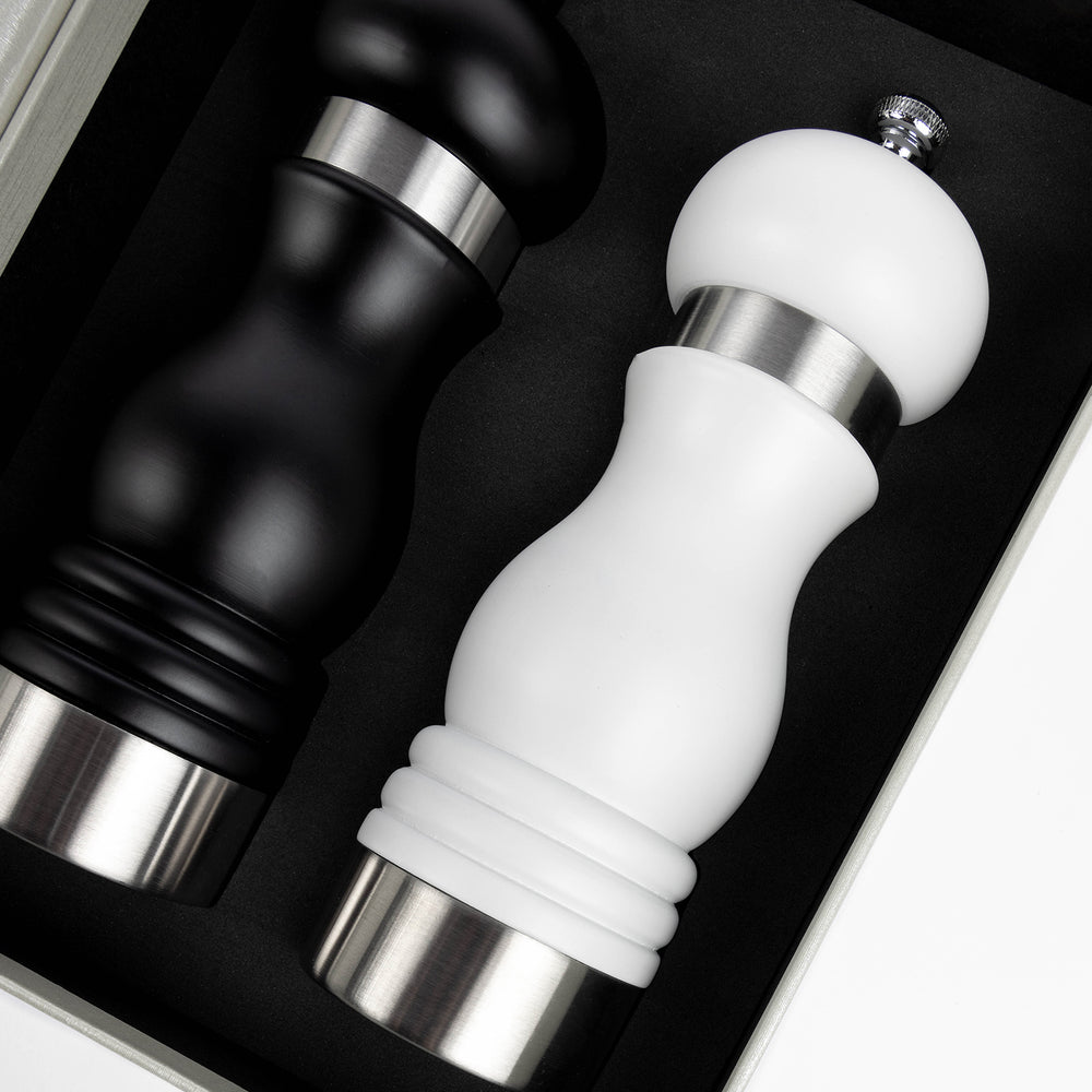 Ett praktiskt set med salt- och pepparkvarnar i lagom storlek för både kök och matbord. De är enkla att använda och ger bra kontroll när du kryddar dina rätter. Den matta ytan gör dem lätta att matcha med olika dukningar och köksstilar. Levereras i en exklusiv presentkartong och passar fint även som gåva.
