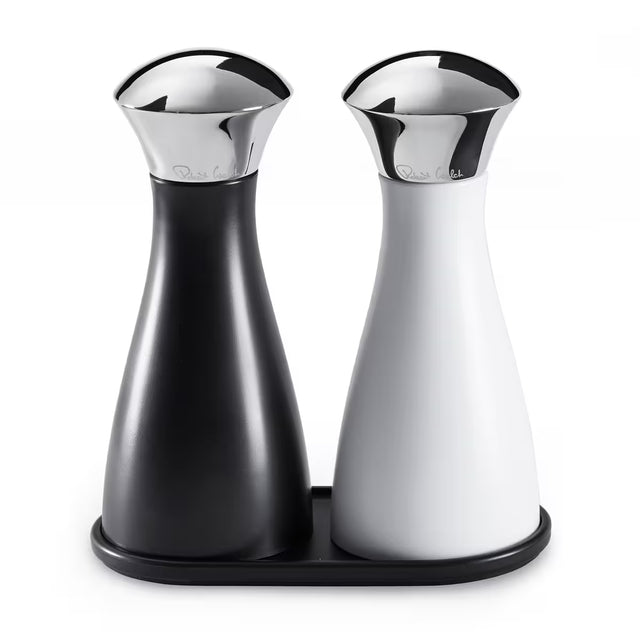 Detta eleganta kvarnset från Robert Welch Signature-serien kombinerar genomtänkt funktion med stilren design. Setet innehåller en svart pepparkvarn och en vit saltkvarn – båda placerade på en matchande bricka i rostfritt stål, som håller bordet rent från kryddrester och gör setet komplett.