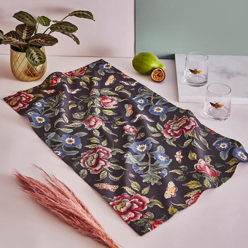 Ge köket en vacker och personlig touch med denna kökshandduk från Spodes serie Creatures of Curiosity. Det mörka blommönstret med inspiration från naturen skapar en elegant kontrast som gör vardagssysslorna lite roligare.