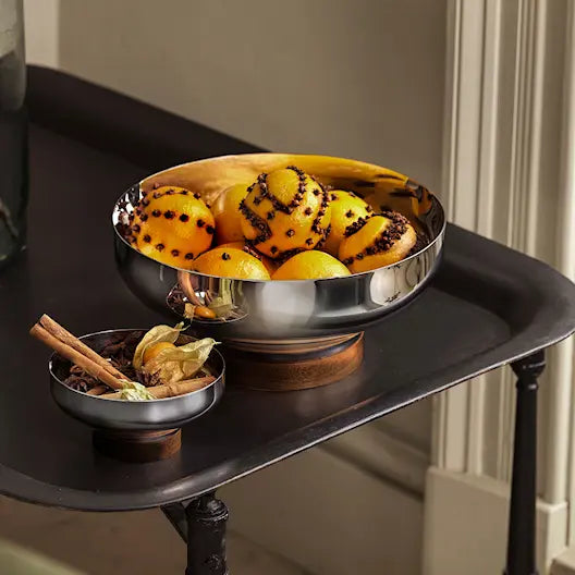Denna Limbrey-skål från Robert Welch är en elegant kombination av glänsande rostfritt stål och varm valnöt. Skålen har en spegelpolerad yta och en avtagbar fot i oljad valnöt som hålls på plats med en magnet – en vacker detalj som förenar form och funktion. Designen är inspirerad av Robert Welchs originalverk från 1963 och förmedlar samma känsla av tidlös brittisk hantverkstradition. Perfekt som fruktskål, serveringsskål eller som dekorativ inredningsdetalj.