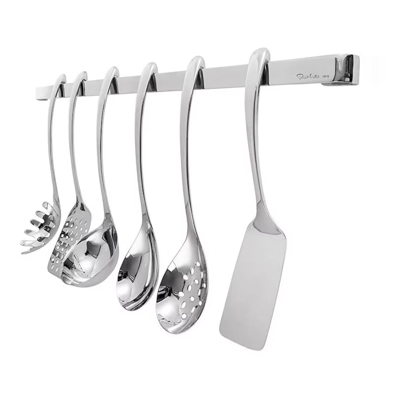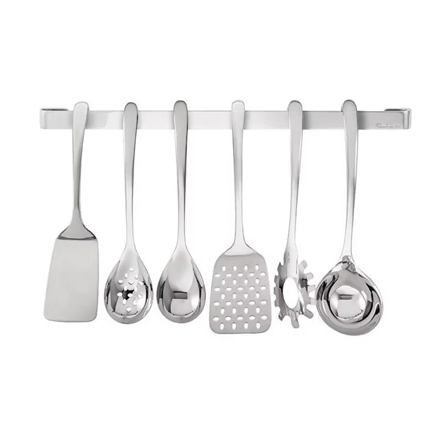 Detta smarta köksredskapset från Robert Welch Signature kombinerar funktion, stil och effektiv förvaring. Setet innehåller en väggmonterad skena samt sex viktiga köksredskap, alla tillverkade i högkvalitativt 18/10 rostfritt stål med spegelpolerad finish.