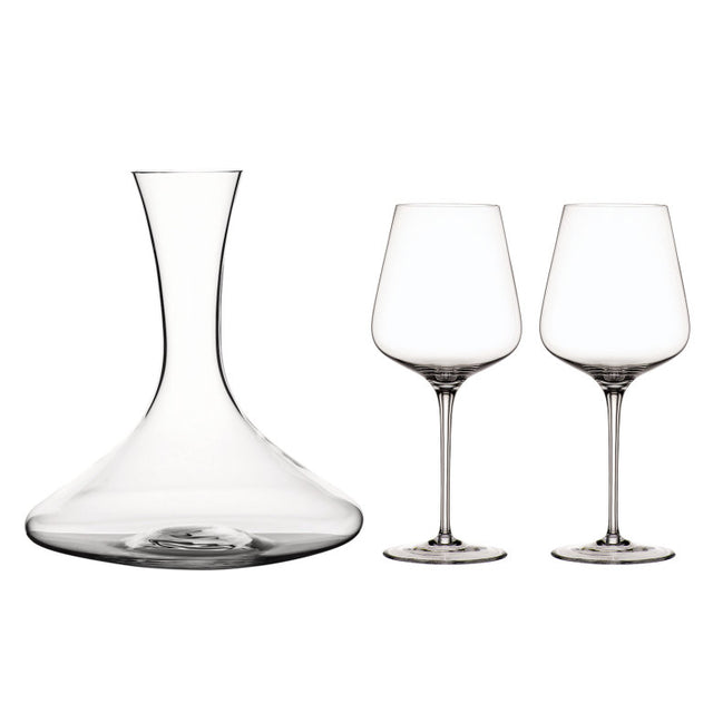 Detta set från Spiegelau innehåller en Toscana karaff och två Bordeauxglas från Hybrid-serien. Karaffen är utformad för att lufta vinet ordentligt, medan de stora vinglasen hjälper till att lyfta fram doft och smak i fylliga röda viner. Ett praktiskt set för dig som vill ha en enkel lösning för vinservering.