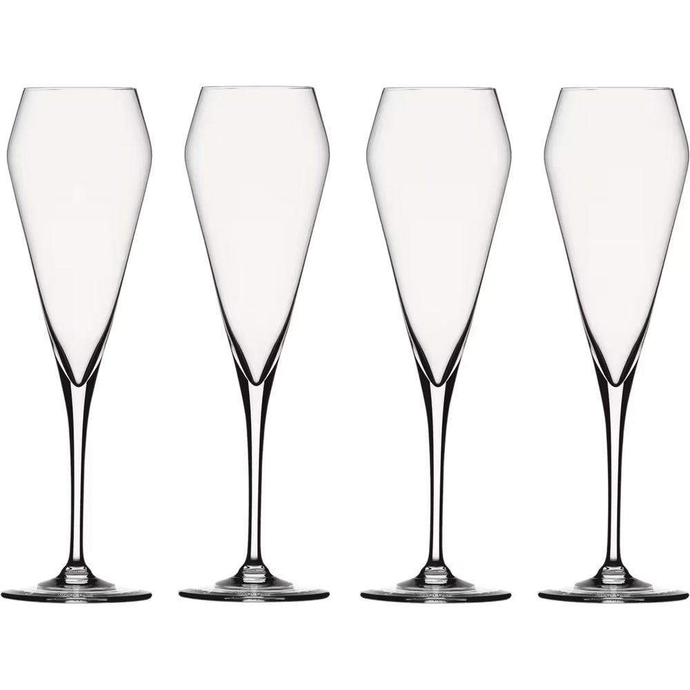 Champagneglaset i denna serie har en smäcker tulipform – ofta föredragen av champagneexperter. Den bredare midjan och något slutna öppningen hjälper till att koncentrera både bubblor och aromer, vilket ger en mer nyanserad och njutbar smakupplevelse jämfört med klassiska flöjtglas eller champagneskålar.