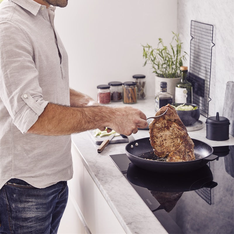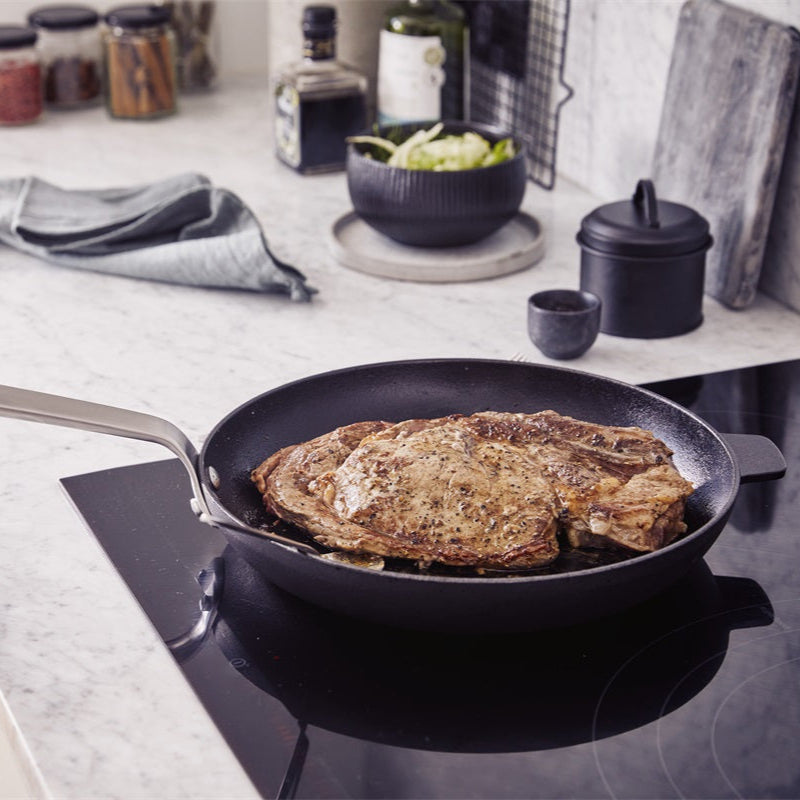 Tack vare sin tunnare konstruktion är den lättare än traditionella gjutjärnsprodukter, men ändå robust nog att hålla i generationer. Det långa handtaget i rostfritt stål håller sig svalt på spisen, medan det praktiska hjälphandtaget ger extra stabilitet när du hanterar pannan. En mångsidig panna som fungerar lika bra på spisen som i ugnen eller på grillen.