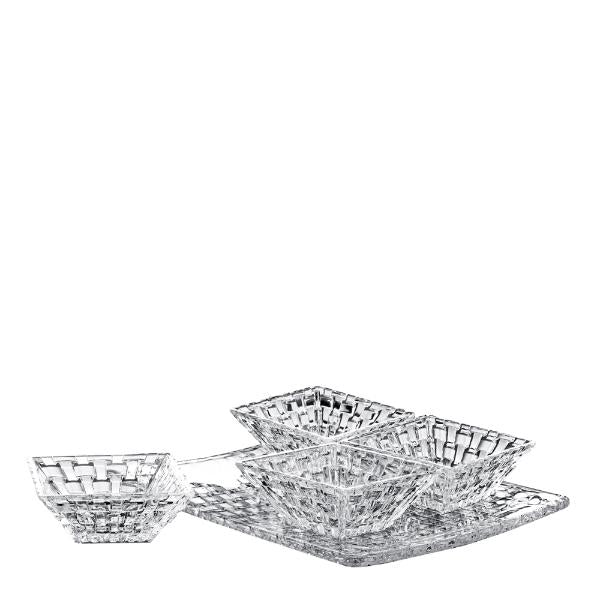 Detta eleganta serveringsset från Nachtmanns populära Bossa Nova-serie kombinerar funktion och form på bästa sätt. Setet består av ett fat och fyra skålar i gnistrande kristallglas med det karakteristiska flätade rutmönstret som reflekterar ljuset vackert. Perfekt för servering av frukt, snacks eller tillbehör – och lika snyggt till vardags som till fest. Serien kan enkelt kompletteras med fler delar för en enhetlig och sofistikerad dukning.