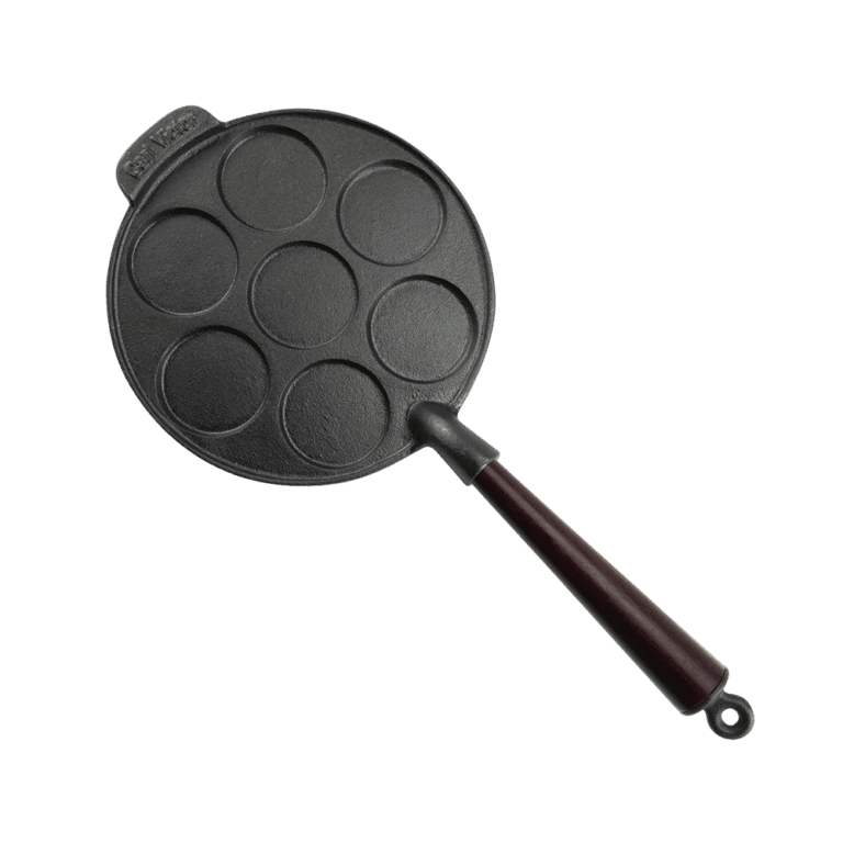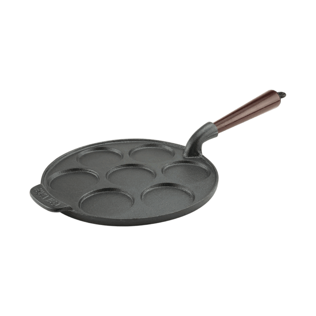 Carl Victor plättjärn i gjutjärn är en klassisk panna med vackert trähandtag i valnötsbetsat bokträ. Den robusta konstruktionen ger jämn värmefördelning och perfekt stekyta – idealisk för att steka plättar, pannkakor eller små rårakor. Tack vare den naturliga inbränningen med vegetabilisk olja får pannan en naturlig non-stick-yta som bara blir bättre med tiden.