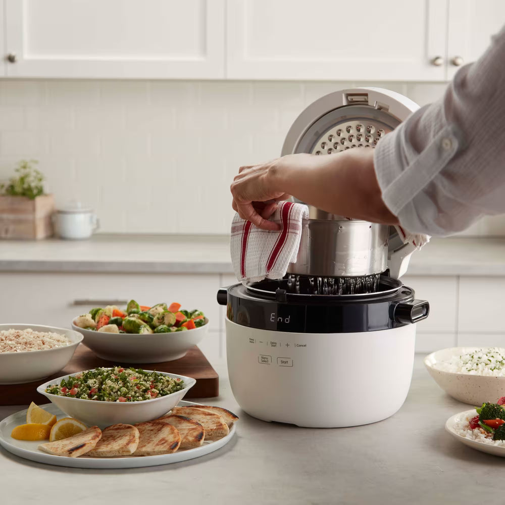 Kastrullen har en non-stick-beläggning som gör att riset inte fastnar, och den avtagbara brickan i rostfritt stål använder den avancerade CarbReduce-teknologin, som kan minska mängden kolhydrater och socker i riset med upp till 40 % – utan att påverka smak eller konsistens.