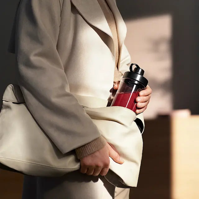 Blendern levereras med två BPA-fria dryckesbehållare i Tritanplast, vardera med 600 ml volym och läckagesäkra skruvlock – perfekt att ha med i väskan. Tack vare sin kompakta storlek tar den minimalt med plats på köksbänken, medan gummifötterna håller den stabil under användning.