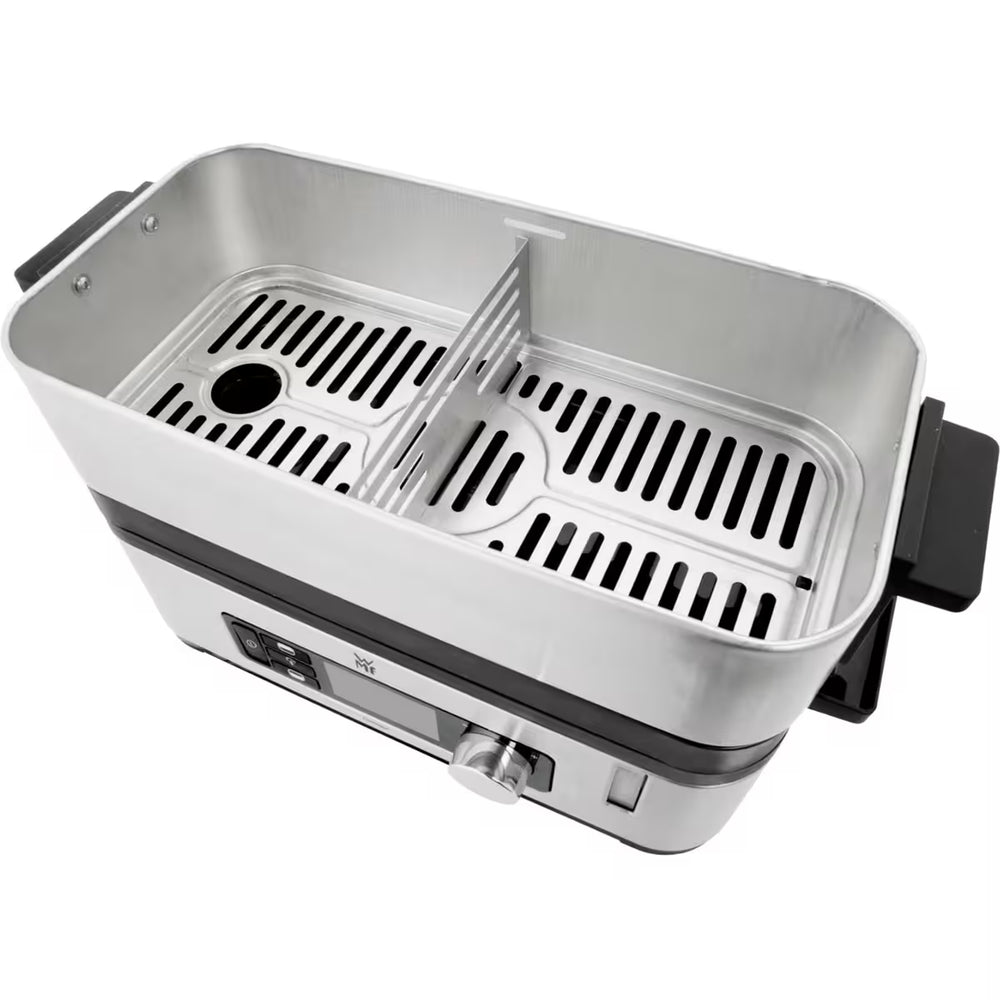 WMF Kitchen Minis Ångkokare är en smart och platsbesparande lösning för hälsosam matlagning. Med två separata matlagningskamrar på 2,15 liter vardera kan du tillaga två olika rätter samtidigt – helt utan att smakerna blandas. Varje kammare har individuell inställning för optimal kontroll och perfekta resultat.