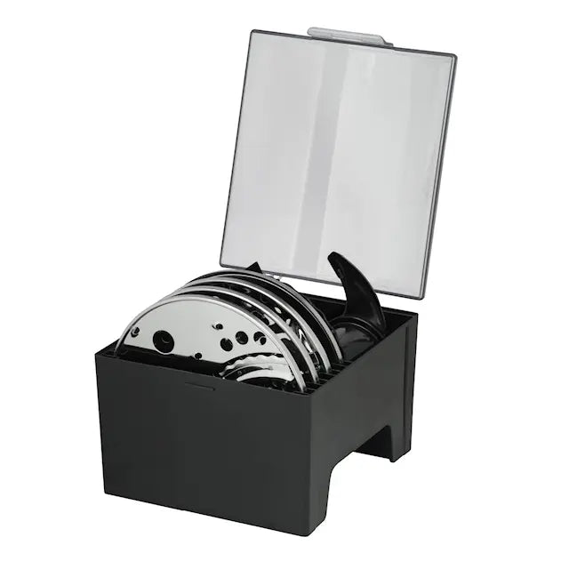 • Tillbehör: 4 skärskivor, 2 knivar, emulgeringsskiva, förvaringsbox