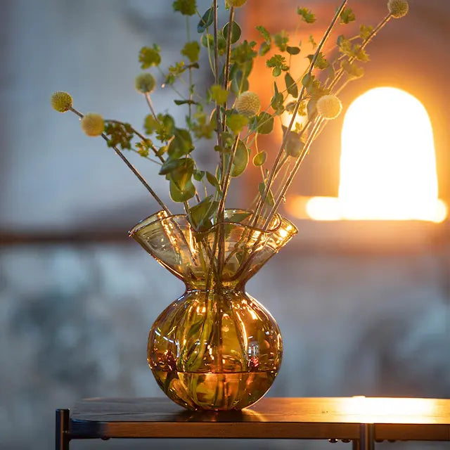 Den gröna nyansen är en av fyra transparenta färger som representerar variation och öppenhet. Varje vas är unikt munblåst, vilket gör att ingen är exakt lik den andra – ett vackert uttryck för hur varje människa är unik. Den vågiga kragen är inte bara estetiskt tilltalande utan även praktisk, då den håller blommorna på plats och hjälper dem att stå vackert.