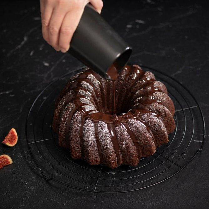 Med en generös kapacitet på 2,4 liter lämpar sig formen för både traditionella sockerkakor och mer kreativa bakverk. Den tål ugnsvärme upp till 230 °C och kombinerar funktionalitet med en elegant mörkbrun och svart design.