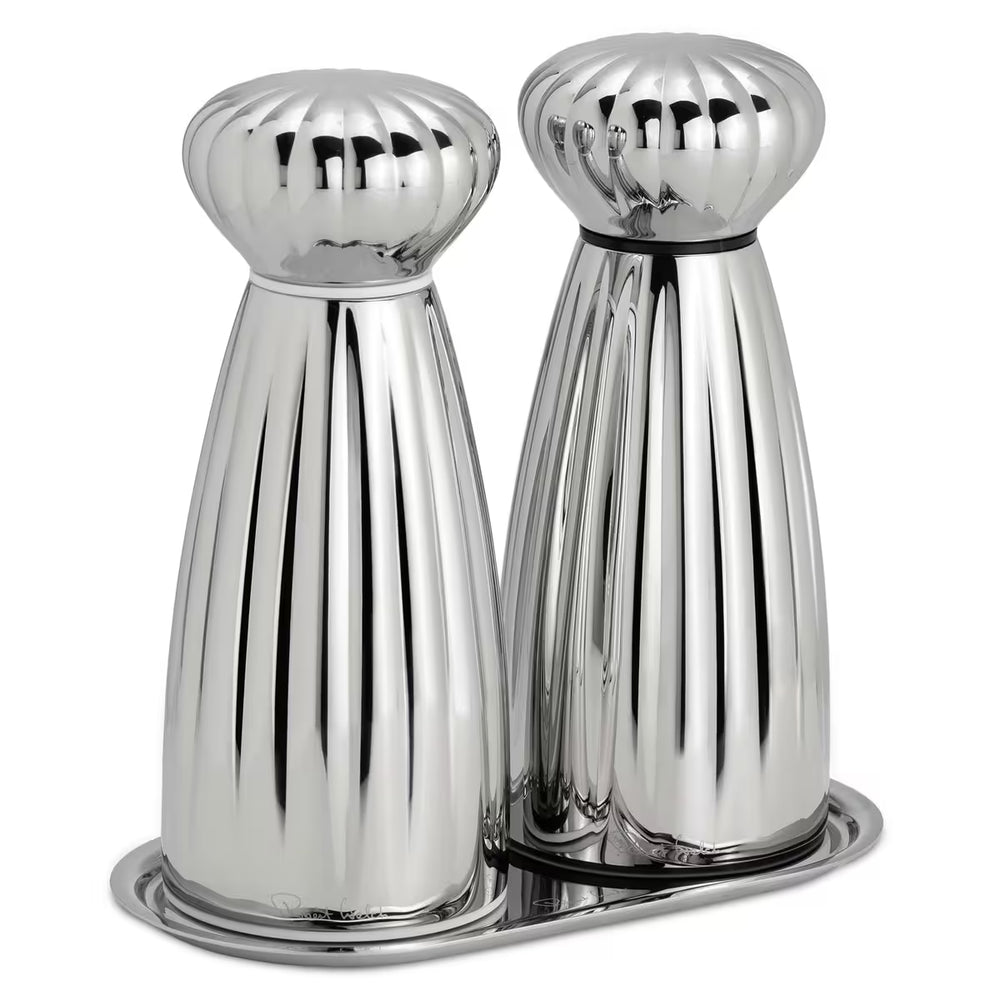 Ge varje måltid en elegant touch med Robert Welch Palm salt- och pepparkvarn med bricka – ett set som kombinerar högklassig design med pålitlig funktion. Med sin ikoniska, räfflade form och spegelblanka finish i rostfritt stål blir kvarnarna ett dekorativt inslag i varje dukning, oavsett om det är vardag eller fest.