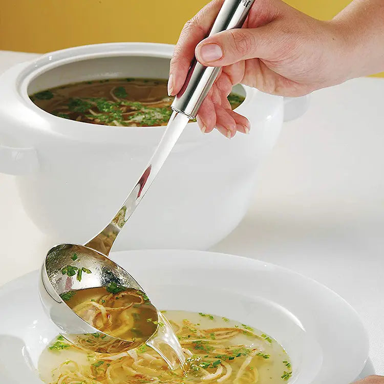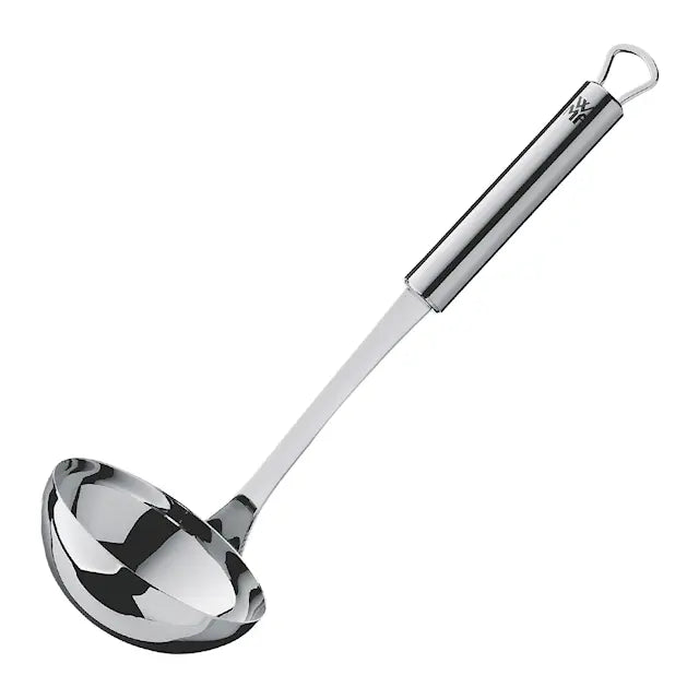 WMF:s Profi Plus soppslev är ett oumbärligt redskap för dig som vill servera soppor, grytor och såser på ett praktiskt och stilfullt sätt. Med sin generösa skedform fångar den upp rikliga mängder vätska, vilket gör serveringen både smidig och spillfri. Det långa handtaget ger ett bekvämt grepp och skyddar samtidigt händerna från värme vid användning i djupa kastruller.