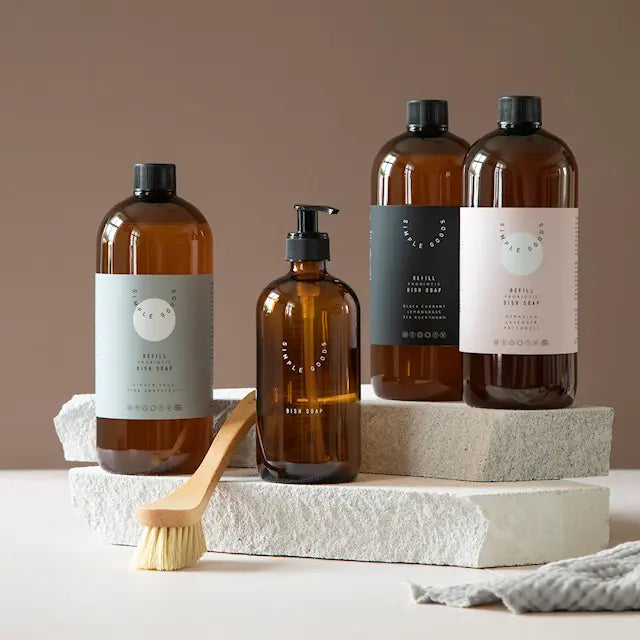 Simple Goods diskmedel med doft av svartvinbär, citrongräs och havtorn erbjuder en miljövänlig och effektiv rengöringsupplevelse – helt utan kompromisser. Formulan är baserad på naturliga och ekologiska ingredienser och berikad med probiotika, naturens egna goda bakterier, som bryter ner fett och smuts samtidigt som de är skonsamma mot huden.