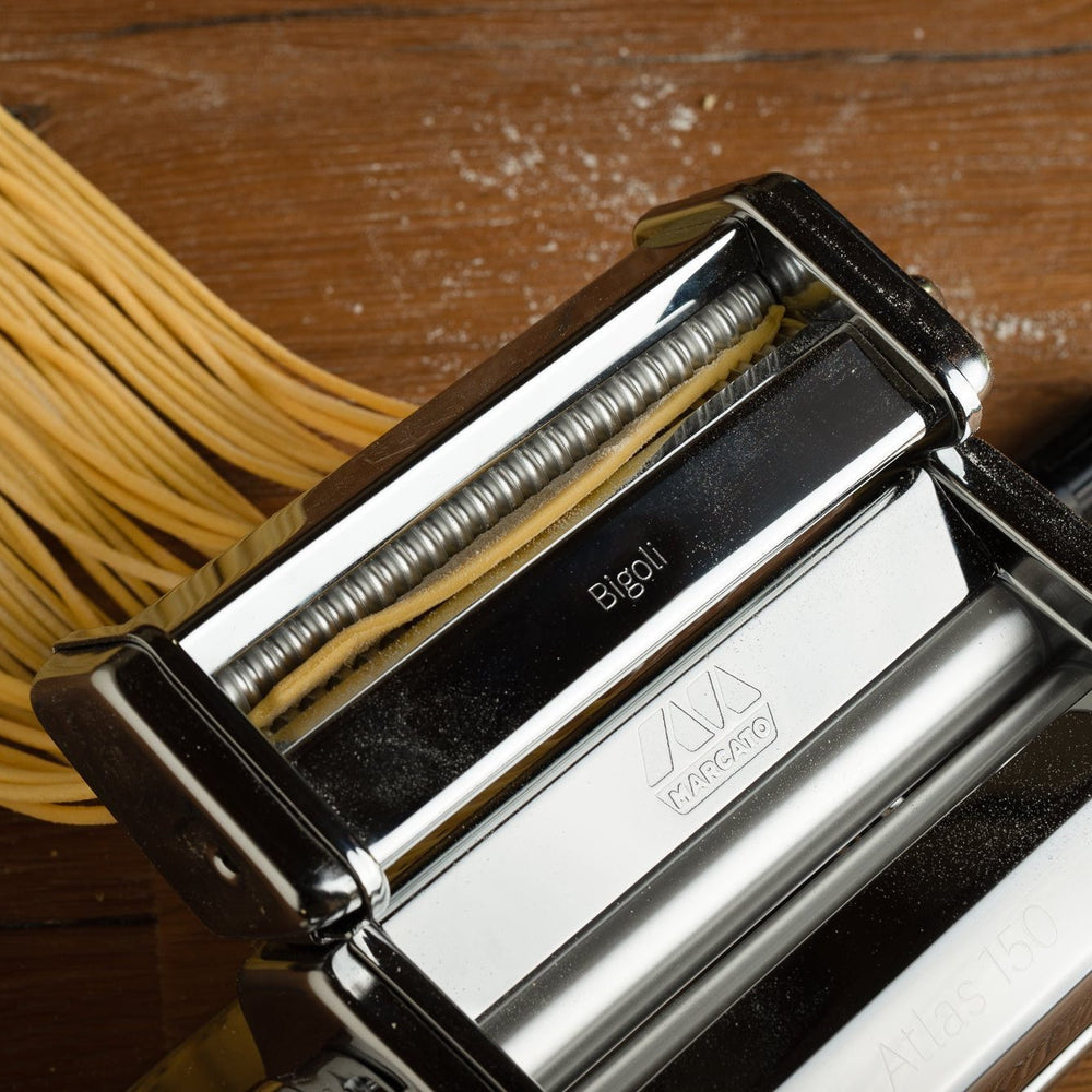 Med denna silverfärgade insats från Marcato kan du enkelt tillverka spaghetti med perfekt form direkt i din Atlas 150 pastamaskin. Insatsen är ett oumbärligt tillbehör för dig som älskar att göra egen pasta och vill kunna skapa världens mest kända pastasort hemma. Med sin kompakta storlek kan insatsen enkelt förvaras i ett skåp eller på en hylla utan att ta upp mycket plats. Tillverkad av aluminium och stål, garanterar den långvarig hållbarhet och hög kvalitet.