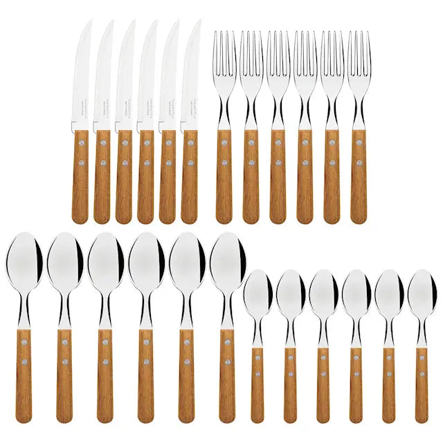 Tramontina bestickset 24 delar är ett elegant och robust tillskott till ditt kök och din dukning. Setet kombinerar brasiliansk hantverkstradition med modern funktionalitet och innehåller allt du behöver för att duka för sex personer. De skarpa bladen i rostfritt stål gör knivarna särskilt effektiva för kött- och grillrätter, medan de ergonomiska handtagen i naturligt trä ger både komfort och en rustik charm som passar lika bra till vardags som vid festliga tillfällen.